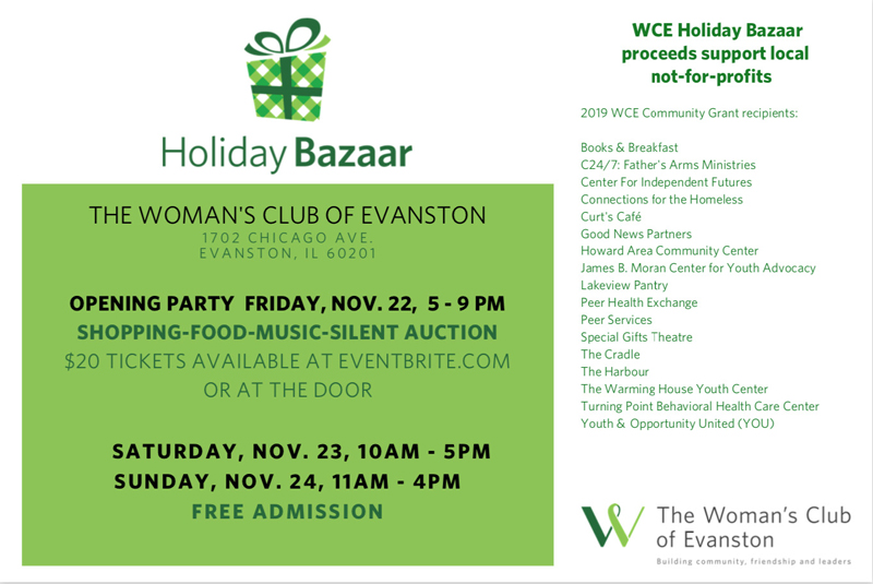 Women’s Club of Evanston Holiday Bazaar at 1702 Chicago Avenue, Evanston, IL: Friday, November 22 ~ 6-9pm, Saturday, November 23 ~ 10am-5p, Sunday, November 24 ~ 10am-4pm.