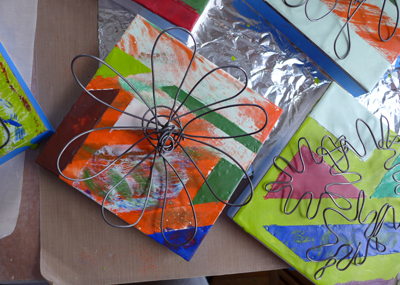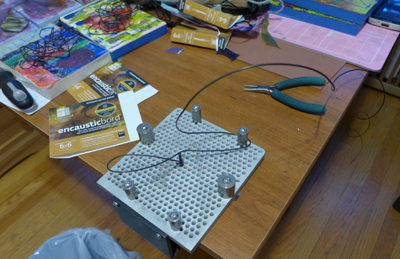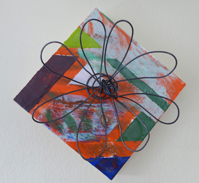 The center wasn’t stable, so I wrapped more wire around it to secure the shape. I bent the petals for dimension and adhered the wire to the encaustic substrate with a mini-iron.