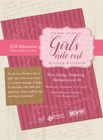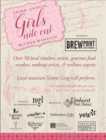 Tannins Wine will be pouring samples and selling wine. Scottie Long will be playing acoustic music, and mini-massages will be available. It’ll be a fun night of inspiration and celebration. The 3rd Annual Girls Nite Out is produced by RGL Marketing for the Arts, Inc., presented by Brewpoint Coffee and sponsored by the Elmhurst Park District. The Wilder Mansion is located at 211 Prospect Avenue in Elmhurst, IL 60126. Admission is $10.