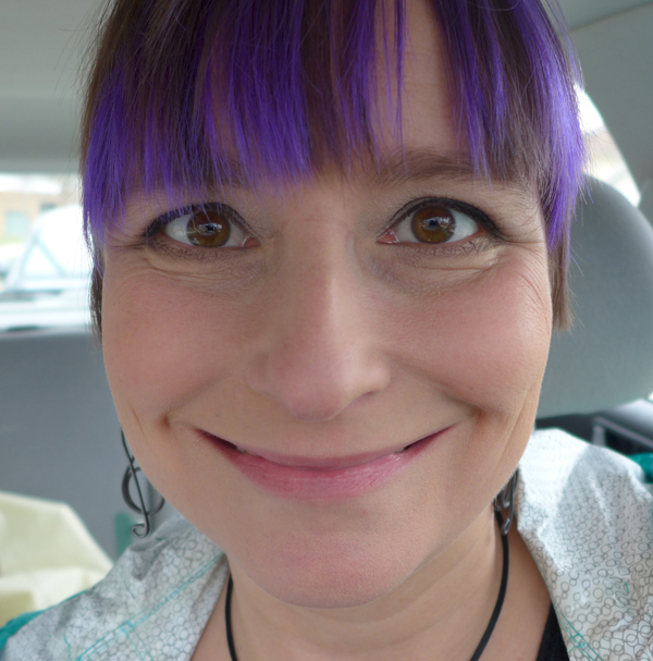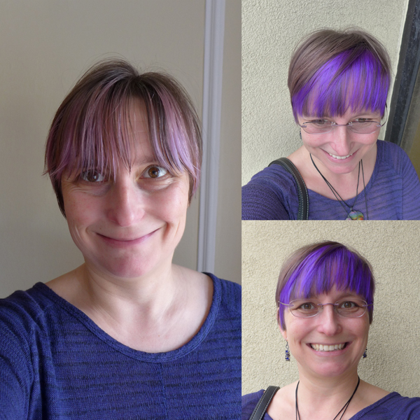 Annette instructed me to bring solid color tops, and she picked out the ones that worked out best on camera and with the purple streaks.
