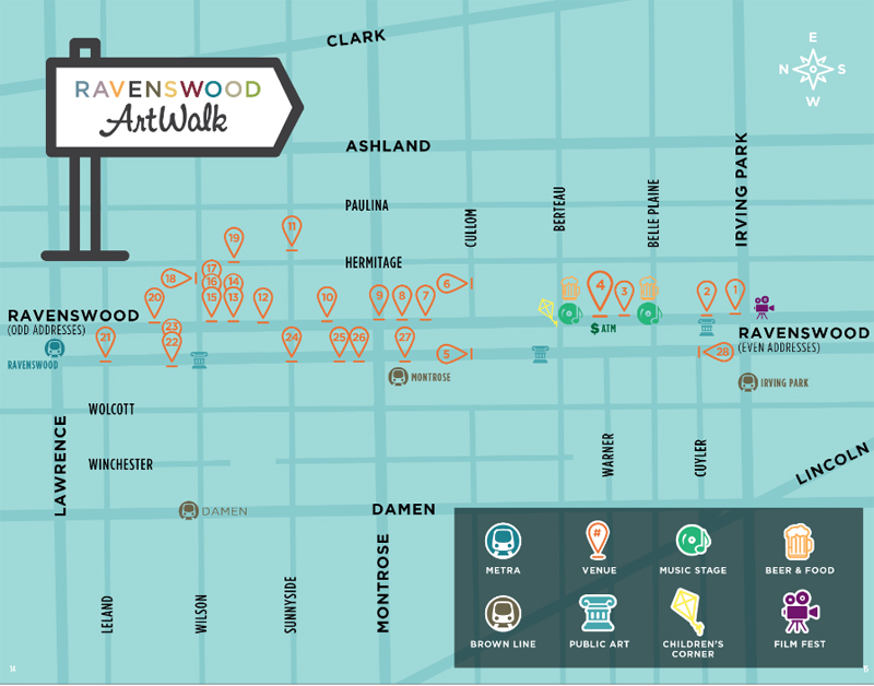 The ArtWalk runs along Ravenswood Ave from Leland south to Irving Park, with open studios, artists in buildings, musical performances and live demonstrations. All businesses are open from 11-6PM. At the center of the festival is the outdoor RAW Street Fest, which features two stages of live music, artists in tents, Begyle Brewing’s craft beer garden, a food truck roundup and children’s activities.