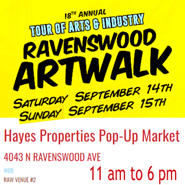 This year the Ravenswood ArtWalk takes place from 11 am to 6 pm on Saturday and Sunday, September 14 & 15. I will return to the Hayes Properties Pop-Up Market, which is venue #2 on the handy-dandy tour map. The official address is 4043 North Ravenswood Avenue, just before the street fair entrance on Belle Plaine.
