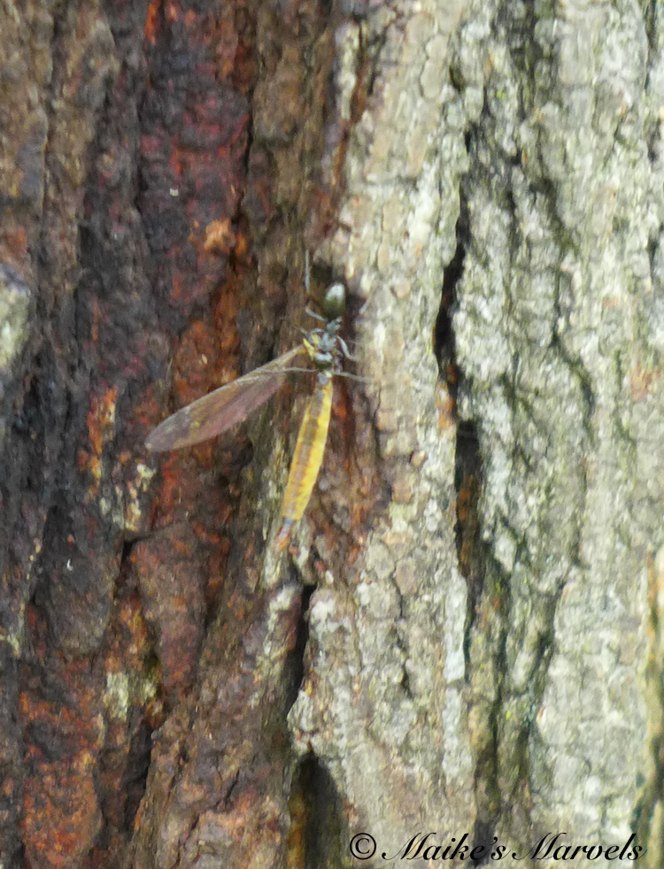 As I was walking along the wood-chipped path I noticed treesap from a tree, and along its trail was an ant lifting a critter twice its size!