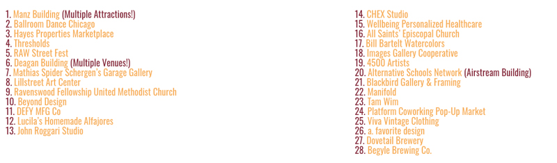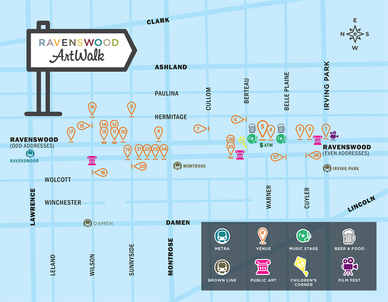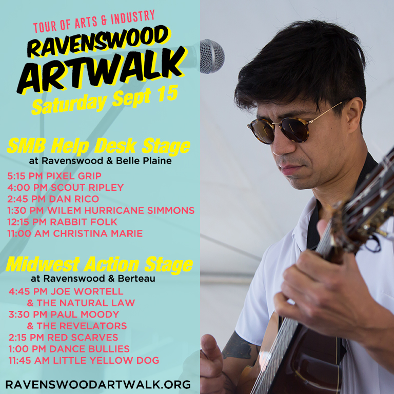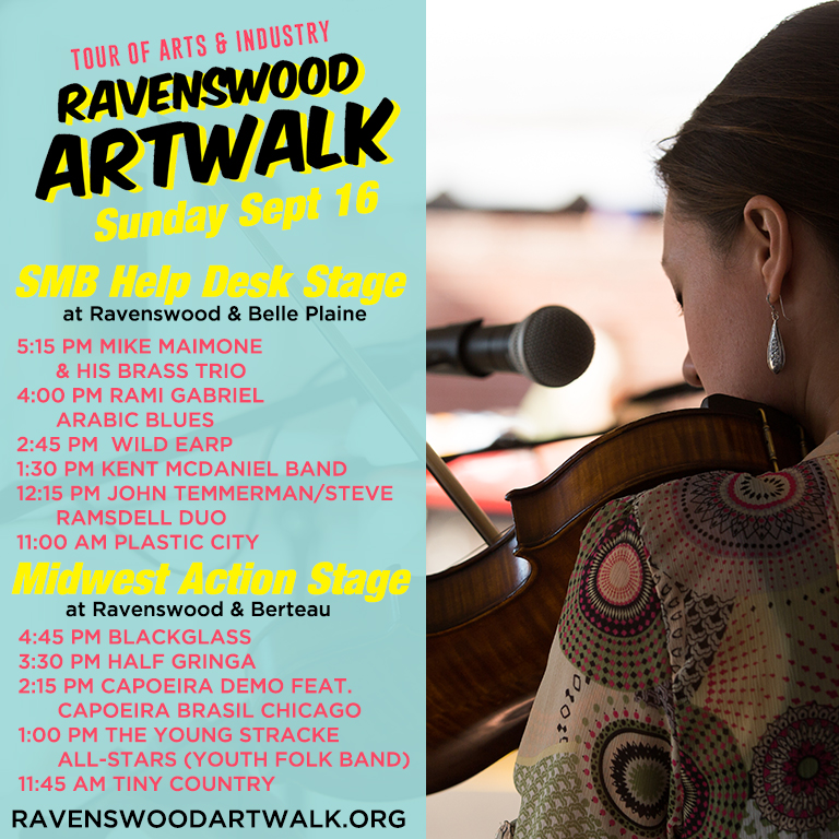 Ravenswood ArtWalk: 17th Annual Tour of Arts & Industry on Saturday and Sunday runs along Ravenswood Ave from Leland south to Irving Park, with open studios, artists in buildings, musical performances and live demonstrations. All businesses are open from 11-6 PM on September 15 & 16. At the center of the festival is the outdoor RAW Street Fest.