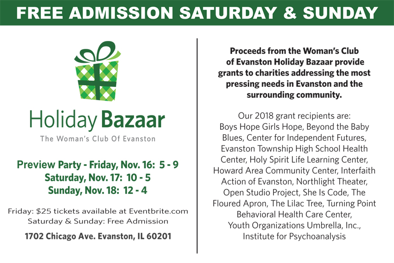 Admission is free Saturday, November 17, from 10 a.m. to 5 p.m. and Sunday, November 18, from noon to 4 p.m. The bazaar is located at The Woman’s Club of Evanston (WCE) historic clubhouse