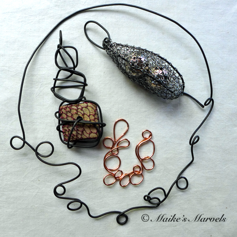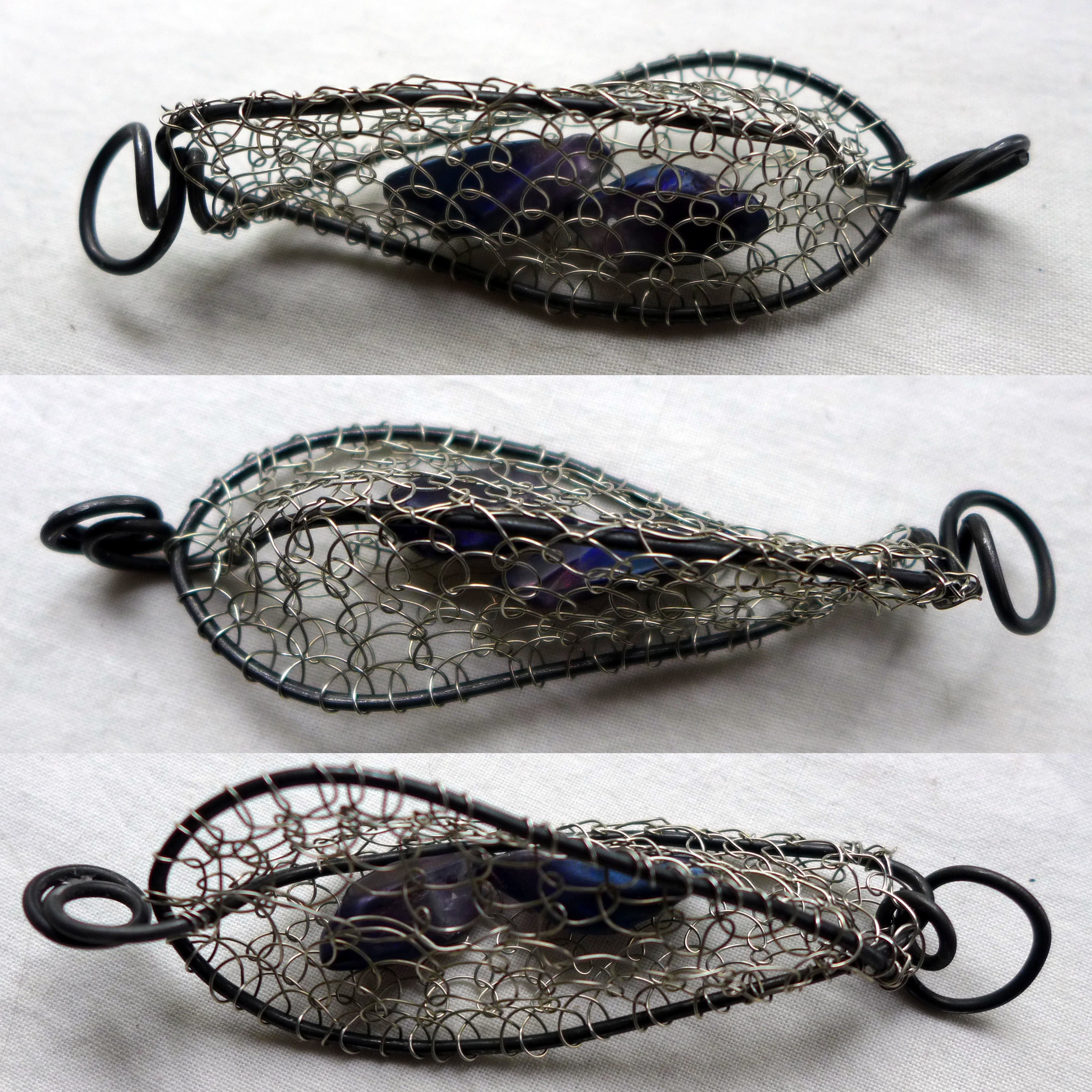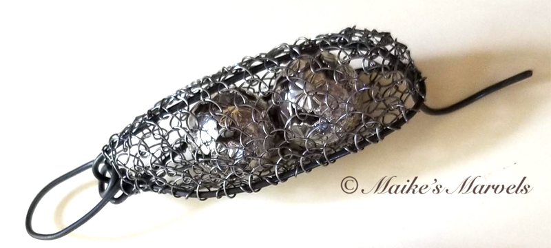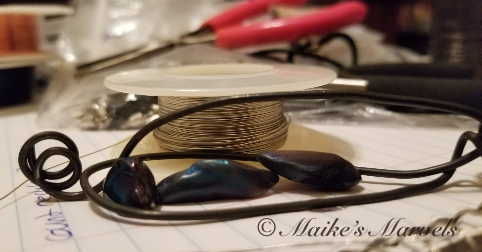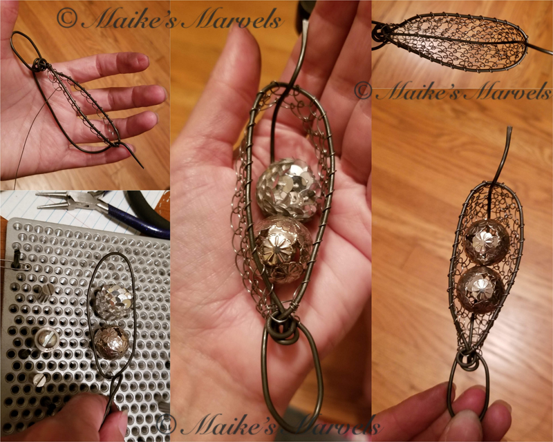 So as I was cooling down in the one room with A/C, I reviewed things I wanted to incorporate into my pods. I had picked up a necklace from a clothing swap, and originally wanted to combine it with a bigger sequin bead. But as I wove the wire I created too much tension, making the pod space to small for the larger sequin bead to jiggle around. So I used two necklace beads instead.