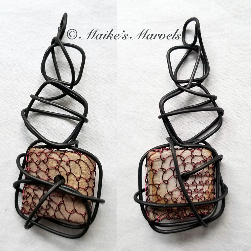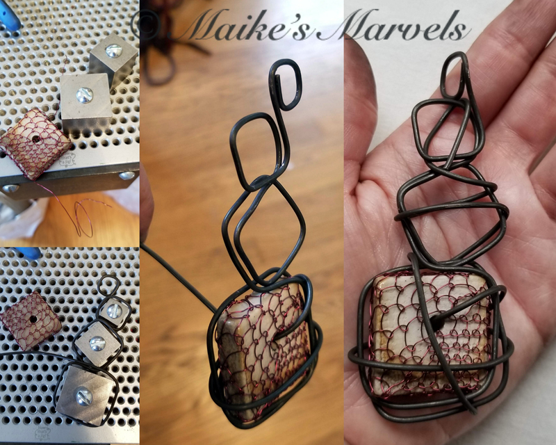 When I did the Wine, Women and Mud class Joanna Kramer gave each of us a little memento. I decided to wire wrap the ceramic square. It sat for a bit until I looked at my square Now That’s a Jig! pegs and played with the setup. The 1-inch peg framed the ceramic tile perfectly. So I made a square design and then wrapped steel wire around it.