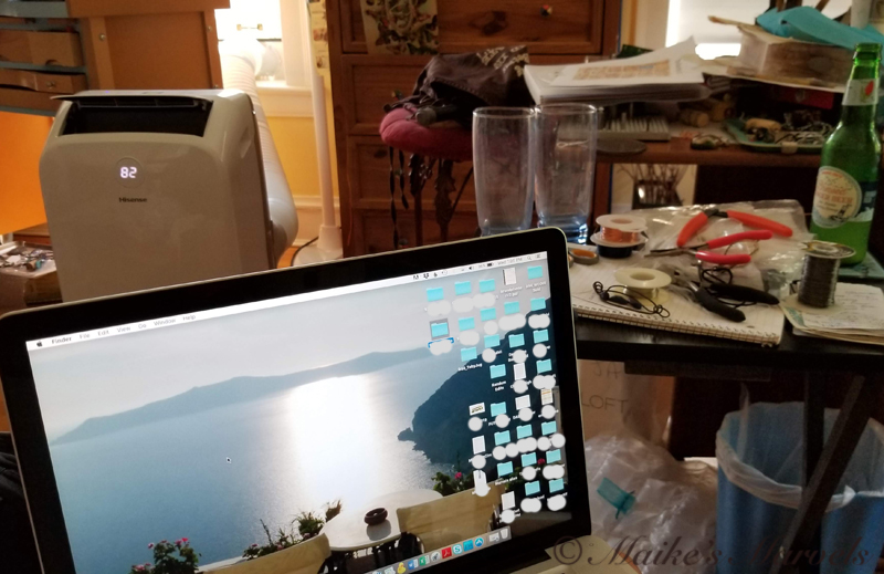 We had a heat wave in Evanston Friday and Saturday. After the ever-lasting winter, I am not complaining. My one A/C unit is in the studio, so I set it up and when the ceiling fans could do no more I cleared off the futon to set up my computer station.