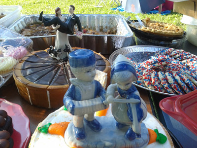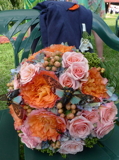 One friend was the officiant (and also brought fantastic corn soufflé and bug cakes), one served as the DJ, one created gorgeous flower arrangements, 6 professional photographers (wedding guests) swarmed around them, one friend prepared all the accoutrements for pulled pork tacos, and everyone brought dessert.