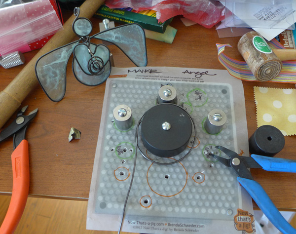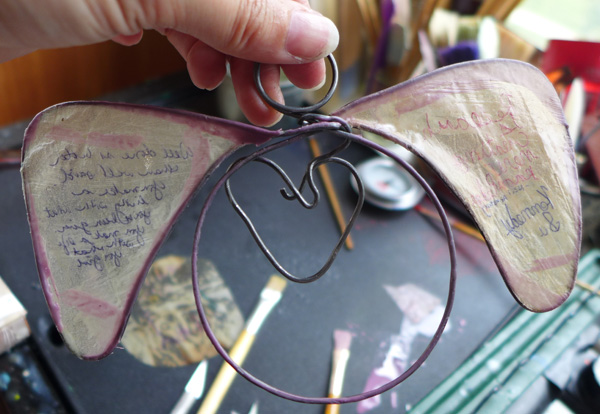 I also fit the wings around the quotes I had been given, and soon a wire angel emerged. Because the young girl had drawn a heart, I knew that would be the angel bodice embellishment.