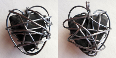 I used a prior heart pendant as a template, except I had to work this one in reverse. Usually I start with the pendant loop that attaches to the necklace cord, but in order to secure the rock I had to start by wrapping it first.