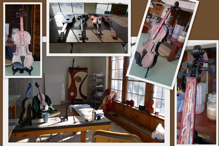 A musical instrument manufacturer sends un-saleable instruments to MOCAH. The bulk of these instruments are still in playable condition, and MOCAH was able to donate 300 musical instruments to a school the week before Christmas. The damaged instruments are incorporated into art pieces, such as these violins, a cello and a piano.