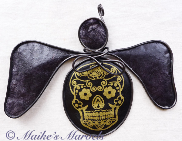 My purples and blues are popular. I also keep selling the skull angels I have in stock. After a 3D encaustic workshop my friend and I went to Blick’s and I found this lovely gold sugar skull paper which of course needed to be angel-fied as well. I love the result.