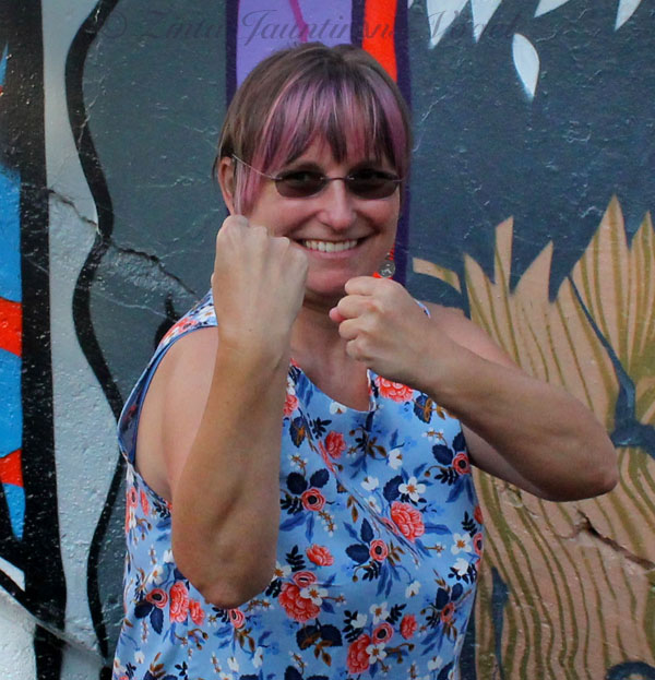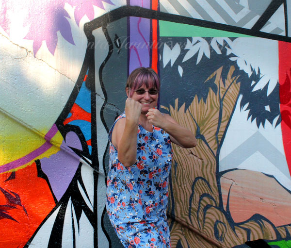 I like my arms, especially now that they are toned from wire bending and Moxie Boxing. We had a blast striking various poses in front of the new Main Street Station Mural (more will pop up on Hip Circle’s web site). The fabulous Zinta JauntirÄns-Vogel took all our photos.