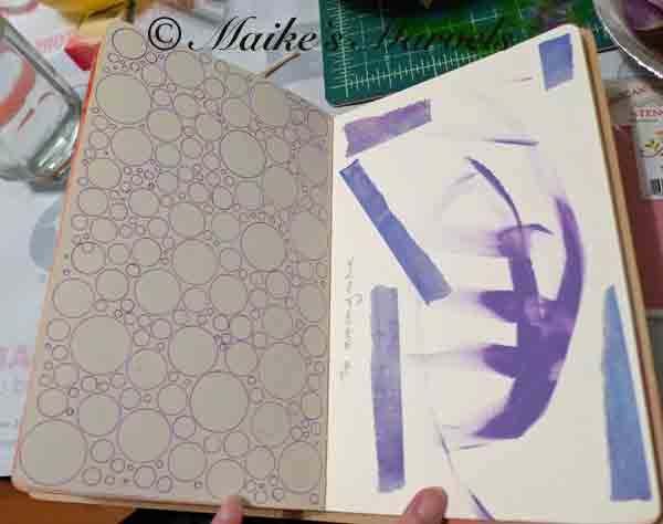 We get various prompts, like drawing circles, doodling on strips of collaged paper, stamping with various random items found around the house, using colors we don’t normally choose etc.