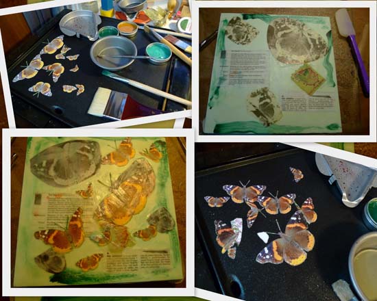 I also wanted to continue with my butterfly theme that seems to be emerging, so I browsed for pictures of local butterflies. When I did research on the Red Admirals, which I had snapped around the corner from my home, I learned that they like to settle down in one place for a week or so. I cut out the photos of two different admirals.