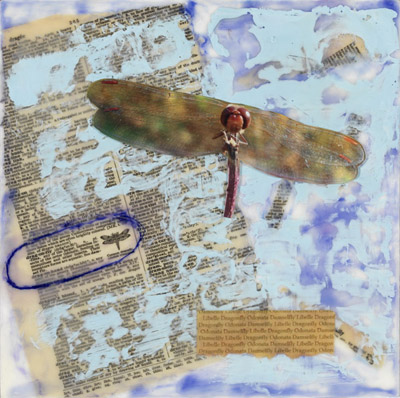 Ruby Meadowhawk encaustic collage by Maike’s Marvels