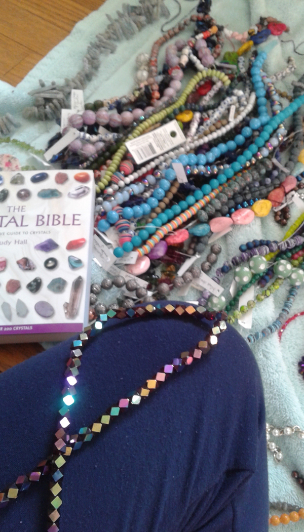 Last week I shopped for some birthstones at Dave’s Down to Earth Rock Shop and at Ayla’s Originals. Ayla’s had a wonderful vintage bead sale and I couldn’t resist picking up a  sparkly iridescent strand.