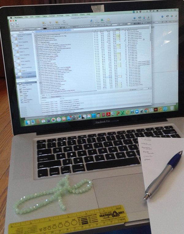 When I went to the Bead & Button Show I had a list of colors and types of beads I could buy. I also had a current photo of my bead rack in the camera for reference. Over two days I made my way through my stash and identified beads that I had not yet learned names of in 2011.