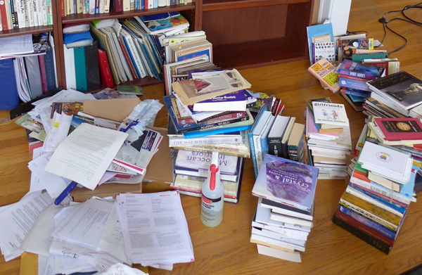 So I started pulling out the books that graced my shelves, to give them a thorough dusting and get them realigned. My collection includes books about nature, a lot of historical and map-making books, biographies of strong women, art books, books for the spirit, including goddess and bellydance books. I also have books about language and writing, along with my own words in print.