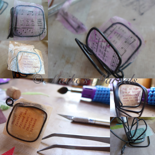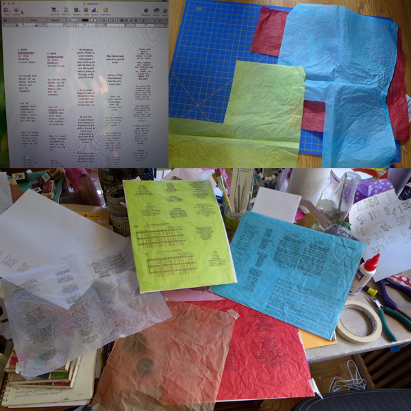 Based on the square peg measurements I created snippets of text in my computer and printed that out on tissue paper to fit in the various designs I have in my head.