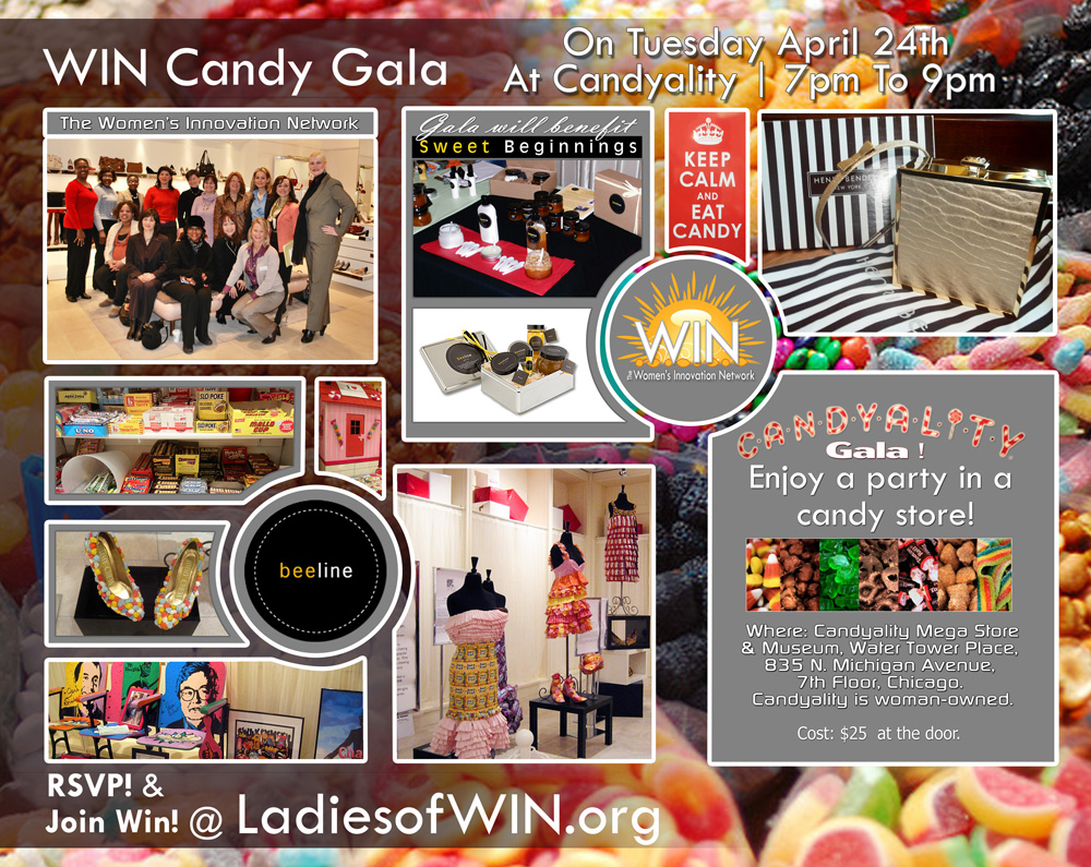 Tomorrow, the sparkles and excitement continue with the Women’s Innovation Network’s Candy Gala. We’ll be surrounded by sweets and a candy museum in the 3,000 square foot store. Fig Catering will be providing a more hearty buffet to round out the sweetness provided by Candyality.