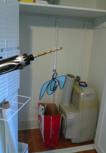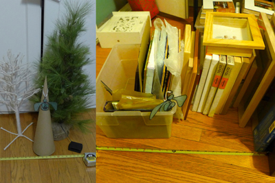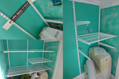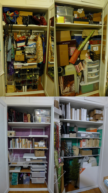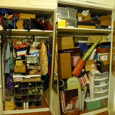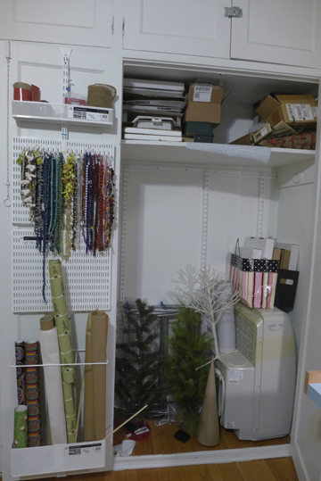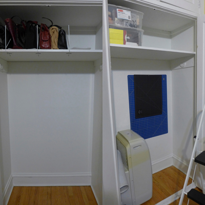Meanwhile, I only house guests twice a year max. So I started storing larger art boards and canvases in the his and hers clothes closets, and added display items that I balanced on a shoe rack. Shipping boxes gained importance, and over time the two large closets became rather inefficient.