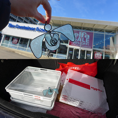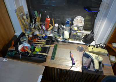 I set up my jeweler’s bench as well, and then waited the long week until I could pick the shelving up.