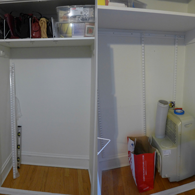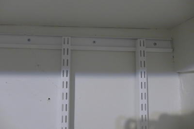 With one closet an inch wider than the other, the allowance for the wooden inserts had been forgotten about, and the top track was too long to install in the other closet (it was an easy re-cut when I went back to the store).
