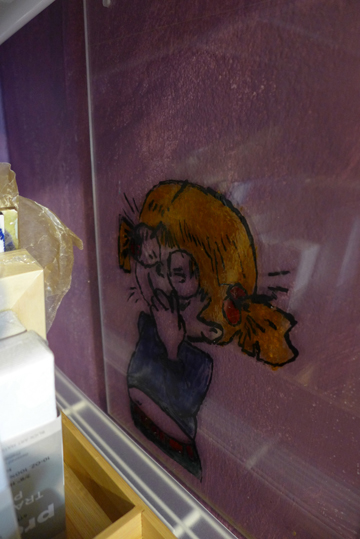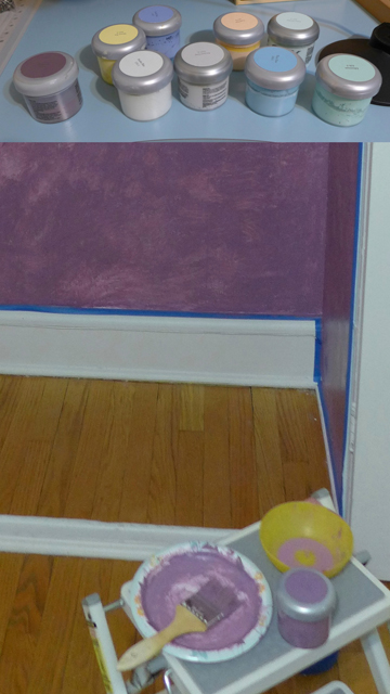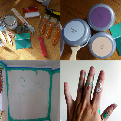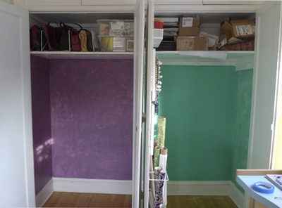 In the middle of that Friday night I decided the closets were boring, and got all my paint samples out. With a crappy brush and a limited supply of years-old paint I started painting one closet with a dry brush effect (to make the half pint stretch).
