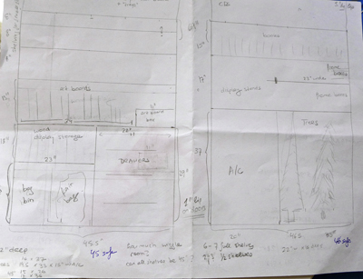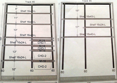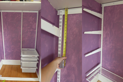 Sandy sent me links to various elfa shelving examples, and I started measuring out what I wanted stored and how it could get laid out with the new system.