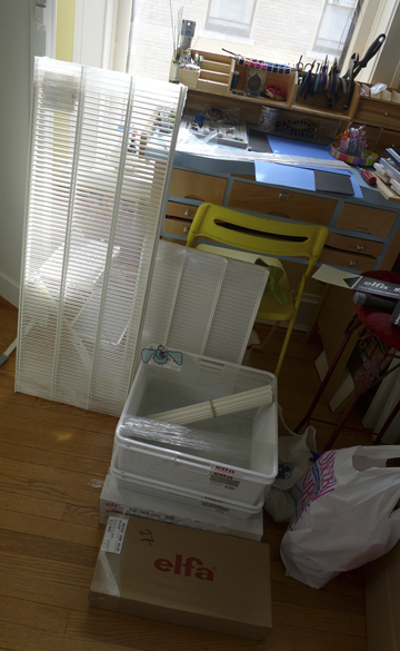 While my bank account is in slight shock at this mega-splurge, it also is a very important investment in my business, in my art and in myself. I can now be more productive by having two work stations and by having things in their place rather than sliding various bins around the floor and moving trays around the sofa.