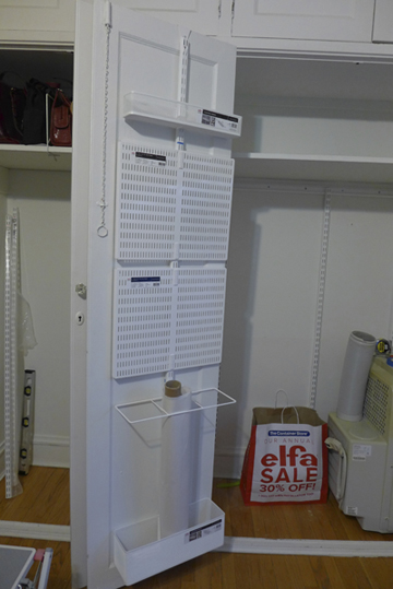 We then met at the Container Store to get the actual design mapped out and pick up the shelving. However, due to the January sale, most parts were on back order, so we only left with the top tracks and hanging standards. I did get to take home a modified version of the elfa utility Gift Packaging Door & Wall Rack Solution, though.
