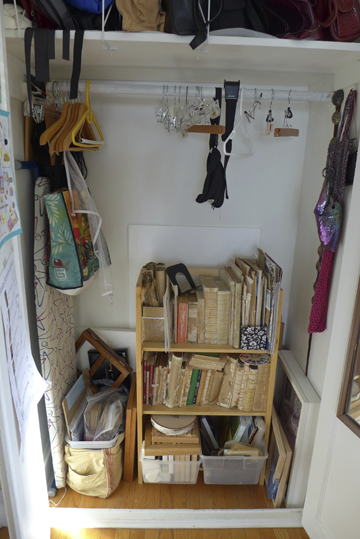 I had picked up some books from the library for inspiration, but knew I needed closet overhaul rather than drool over vintage architect drawers and other items hard to find and get up stairs.