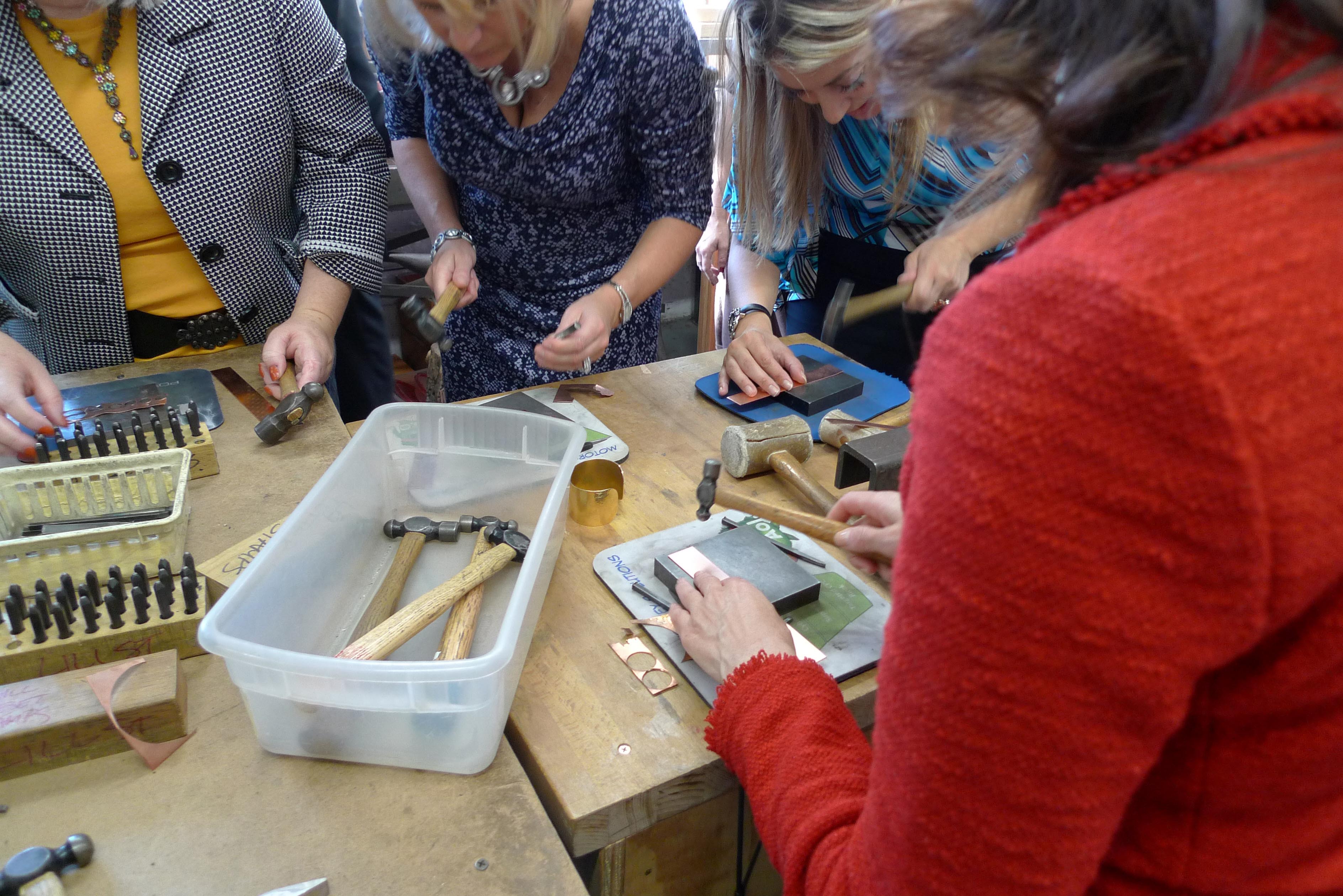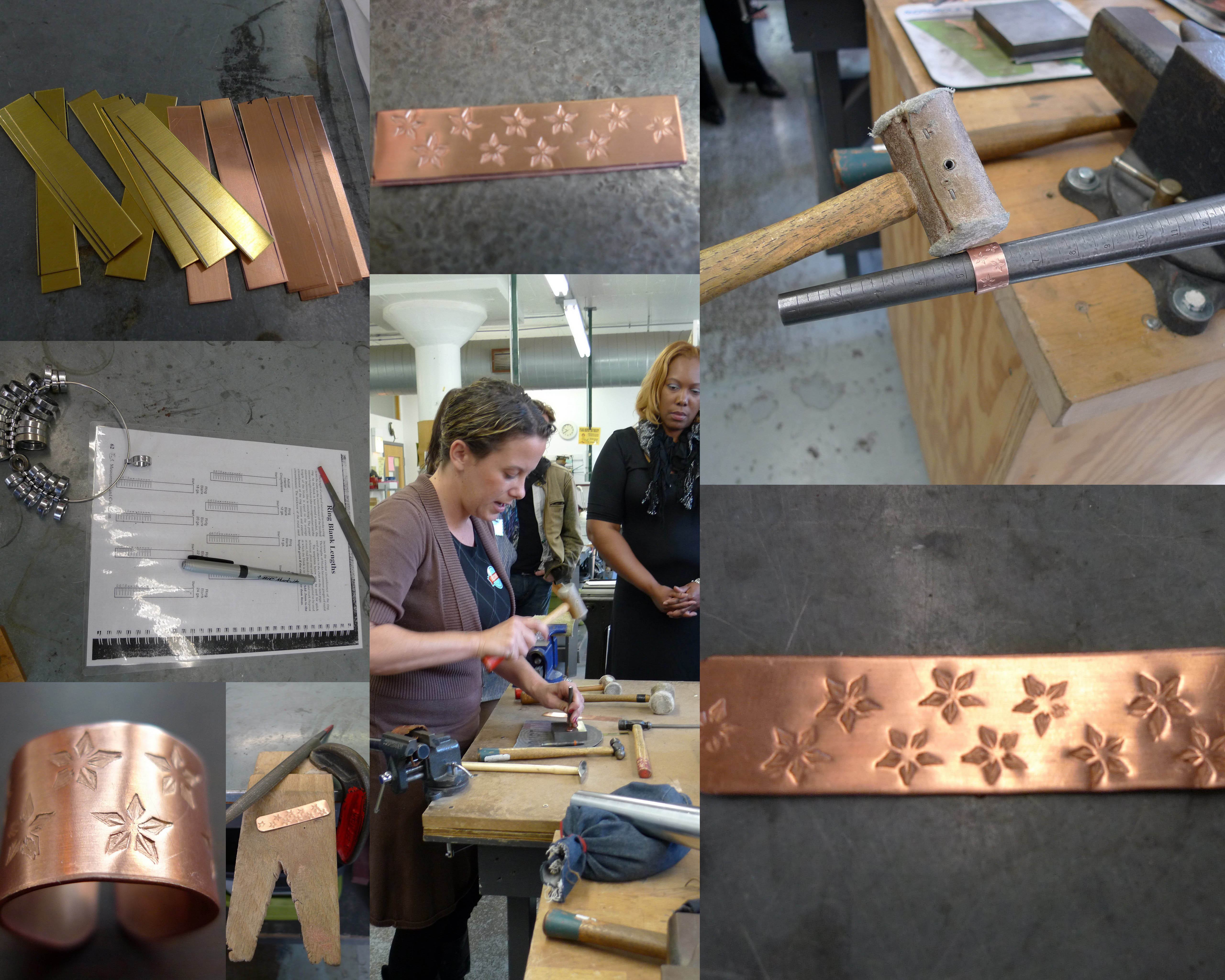 I’ve been playing with wire lately, but learning how to make a cuff ring/cuff bracelet was very educational. Susan Franker, Katie Mills and Maria Leppo showed us how to take a strip of brass or copper and embellish it with hammer strikes or decorative stamps. Hammering is quite therapeutic. 🙂