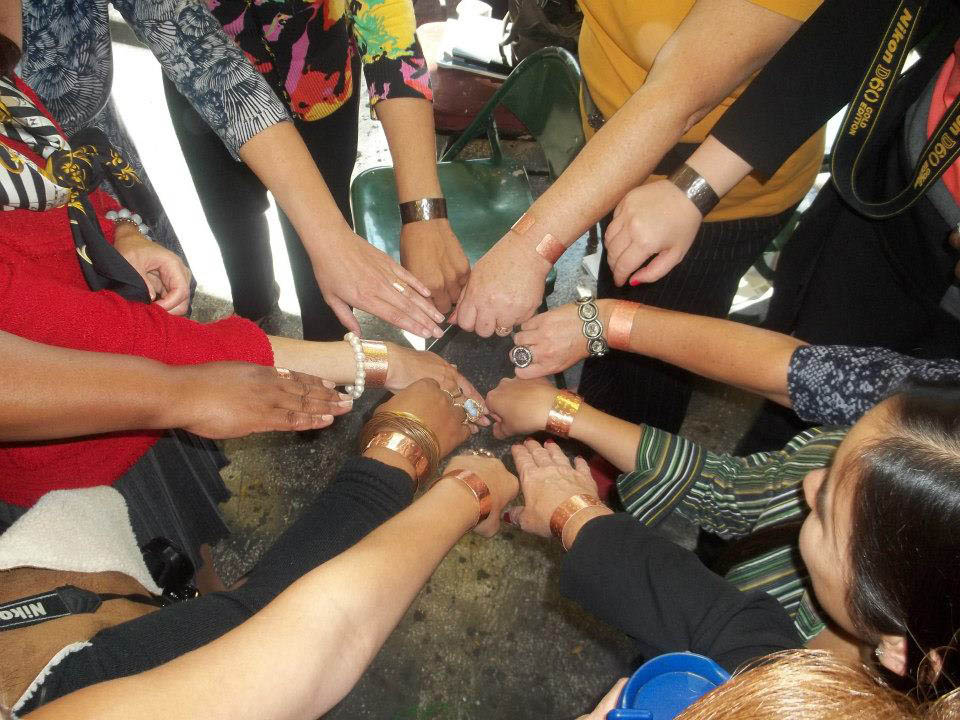 The bracelets were annealed (heated) to make them flexible for bending. And some people opted for patina on their bracelets.