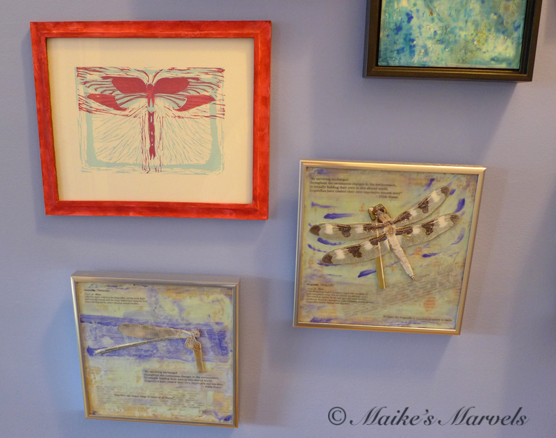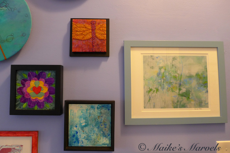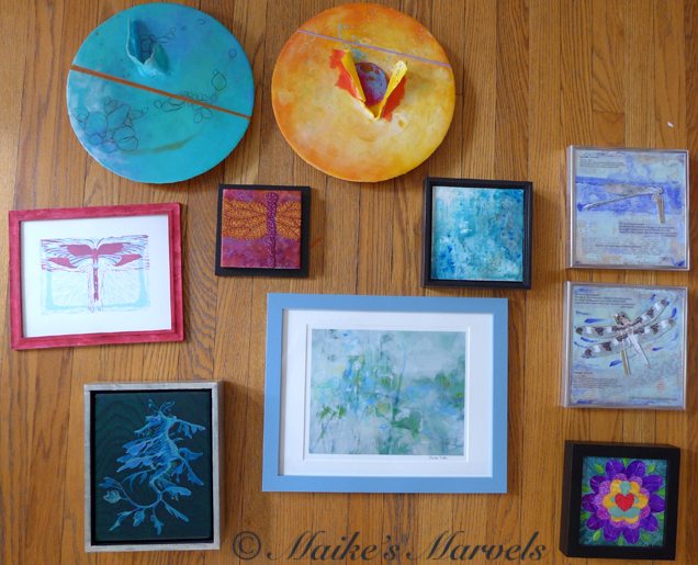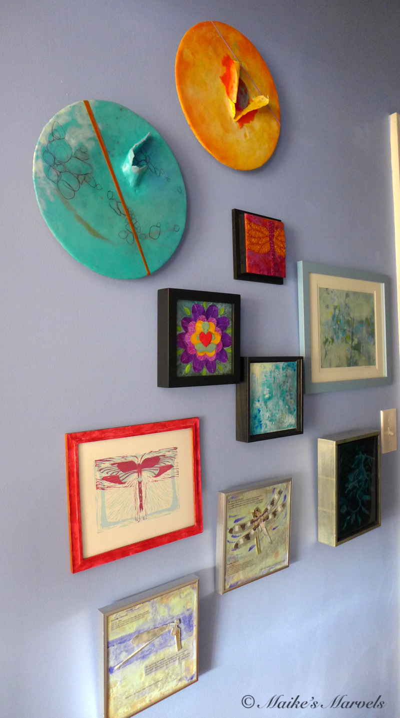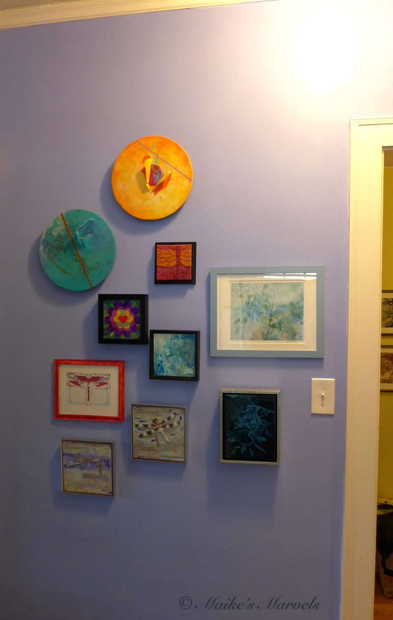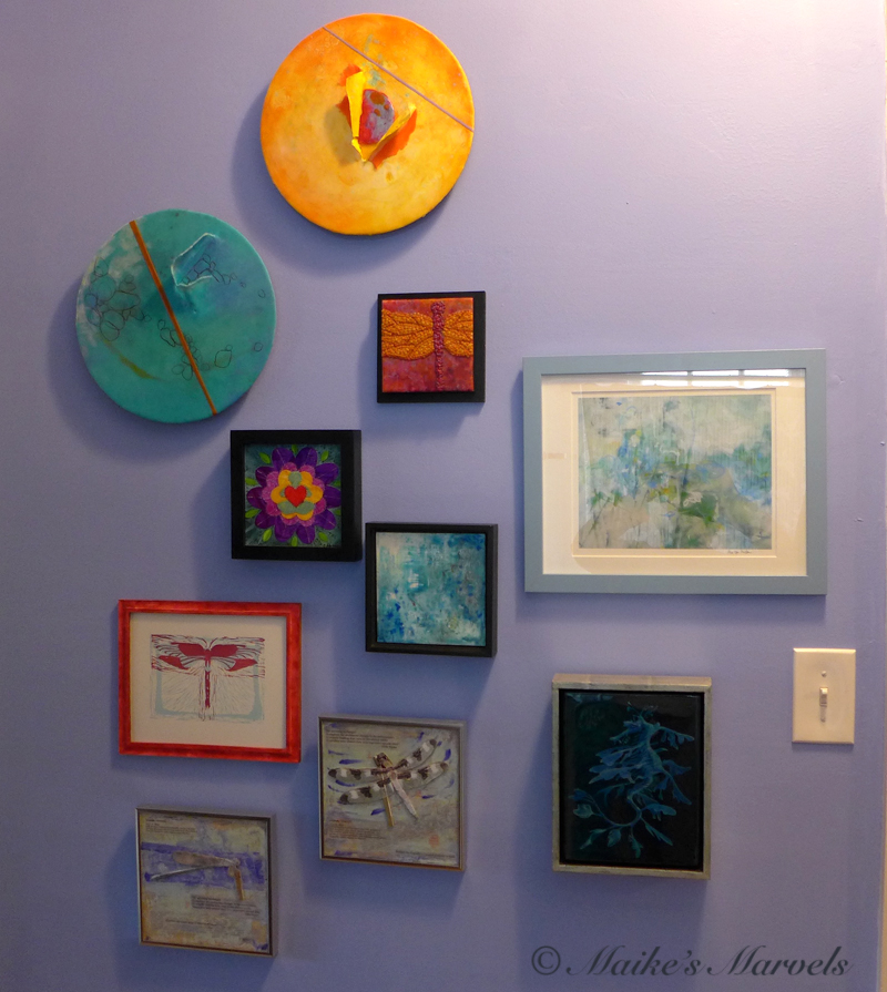 On my wall are Carol Hamilton, Cindy Lesperance, Chai Wolfman, Rebecca Stahr, Ahavani Mullen, and Jason McPhillips. I also added a linocut and an encaustic dragonfly diptych by me.