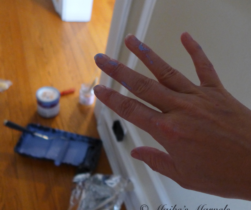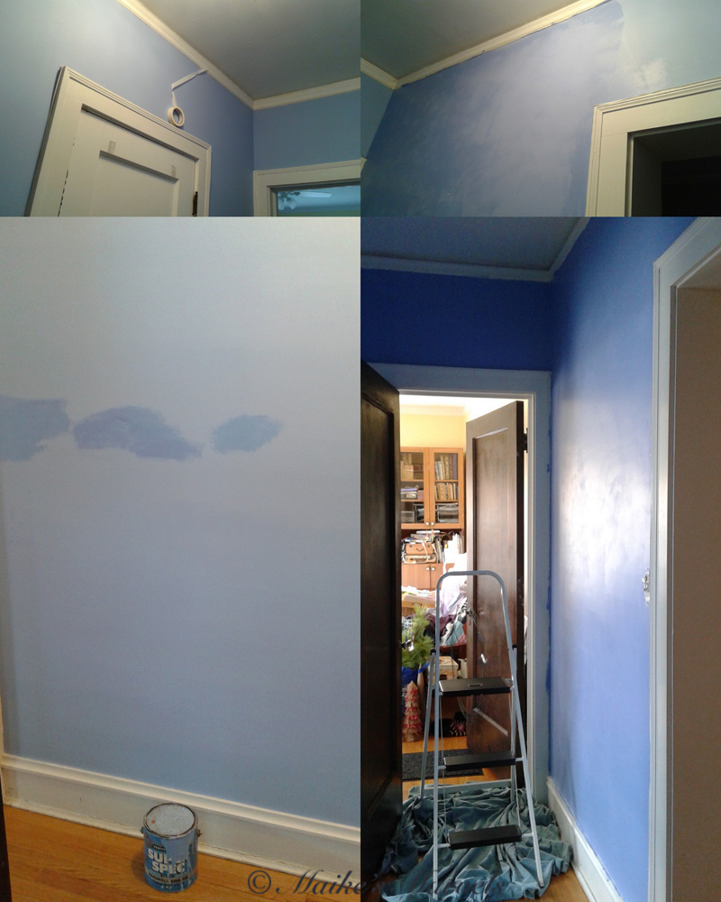 I had an old sample of the same exact paint, but when I tried to touch up the scrapes and scratches, the new paint dried on much darker. So off to Home Depot I went to remix the paint. Initially I put on one layer and let it dry over night. Unfortunately, that was not sufficient. I had to paint the whole hallway to not have such a contrasting darker wall, and needed to fix the inadvertent faux finish I had created. But a few hours of elbow grease got me a fresh hallway./a>