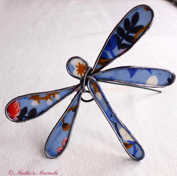 One dragonfly stake with my blue dress fabric is undergoing garden testing in Germany right now. My own outdoors dragonfly is still doing well after a few storms and heat waves.