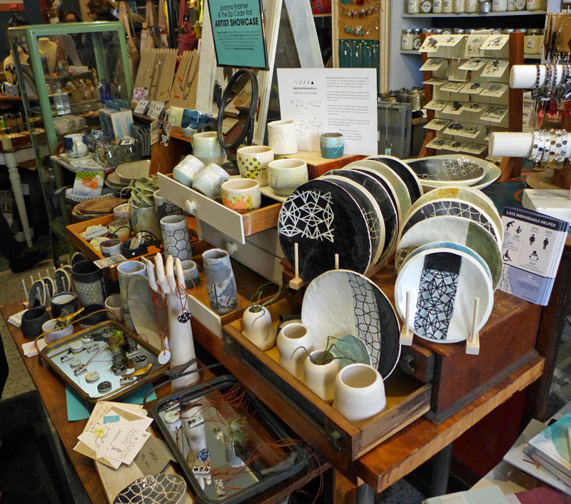 This past weekend I visited Stumble & Relish to peruse and pick out a collaboration of Jason Brown (Geocommunetrics) and Joanna Kramer. Together, they made porcelain shapes of plates, vases and pendants, and then glazed these. The glaze was then overlayed with Jason’s geometric depictions of the 60201, 60202, and 60203 Evanston zip codes.