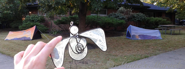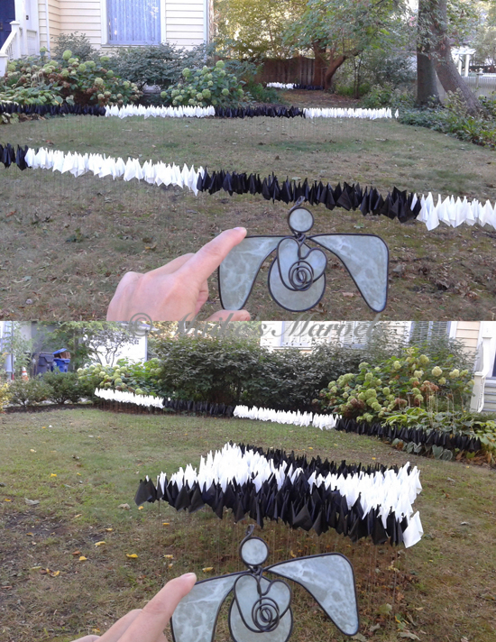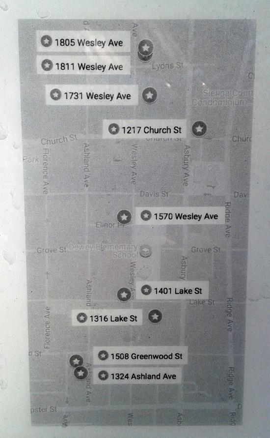 On a recent summery Sunday I did an art scavenger hunt in Evanston. As part of the 3rd Terrain Biennial, Evanston artists have organized eight host locations on a walkable route, along Wesley and Florence between Emerson and Dempster. Eight homes are hosting the work of nine artists on the front yard, porch, or facade. Participating artists include Ben Blount, Paul Catanese, Shawn Decker, Alice George, Patrick Lichty, Kristin Mariani, Niki Nolin, Laurie O’Brien, Mat Rappaport, Anne Hayden Stevens and Kevin Valentine.