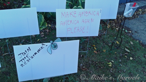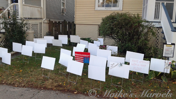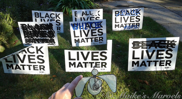 Next to this tiny neighborhood, nine full-sized Black Lives Matter yard signs, one for each of Evanston’s wards, were altered/defaced to reflect the recent vandalism and theft of Black Lives Matter signs in Evanston neighborhoods.