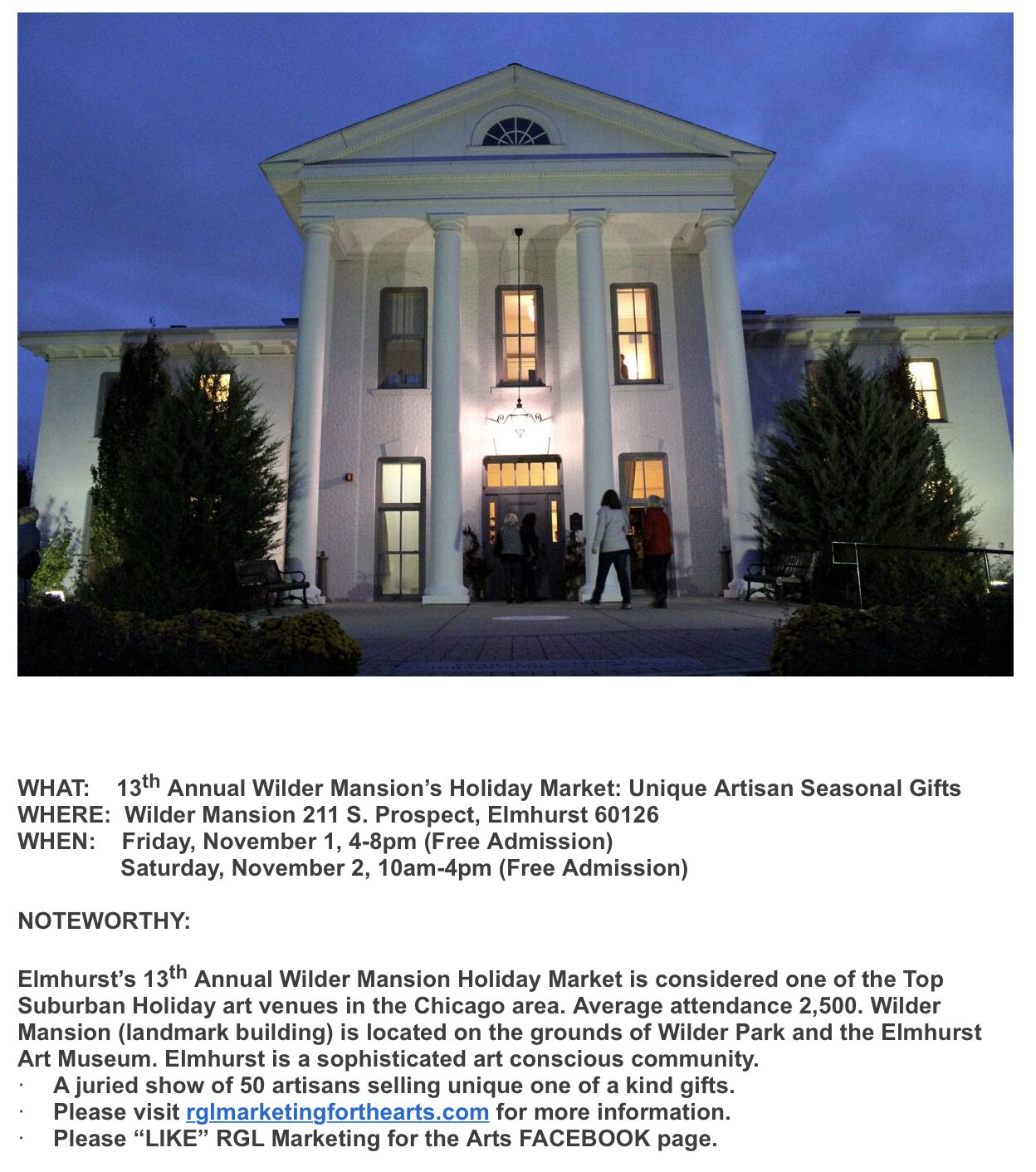 13th Annual Wilder Mansion Holiday Market at the Wilder Mansion 211 Prospect Ave. Elmhurst, IL: Friday November 1st / 4pm-8pm & Saturday November 2nd / 10am-4pm.