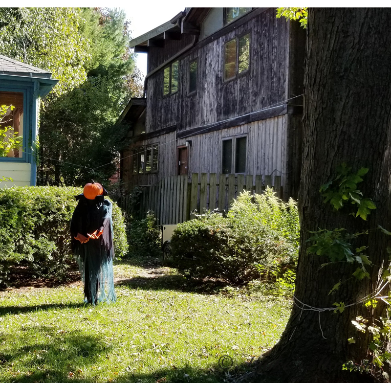 This pumpkinhead can be scary depending on the shadows the trees cast.