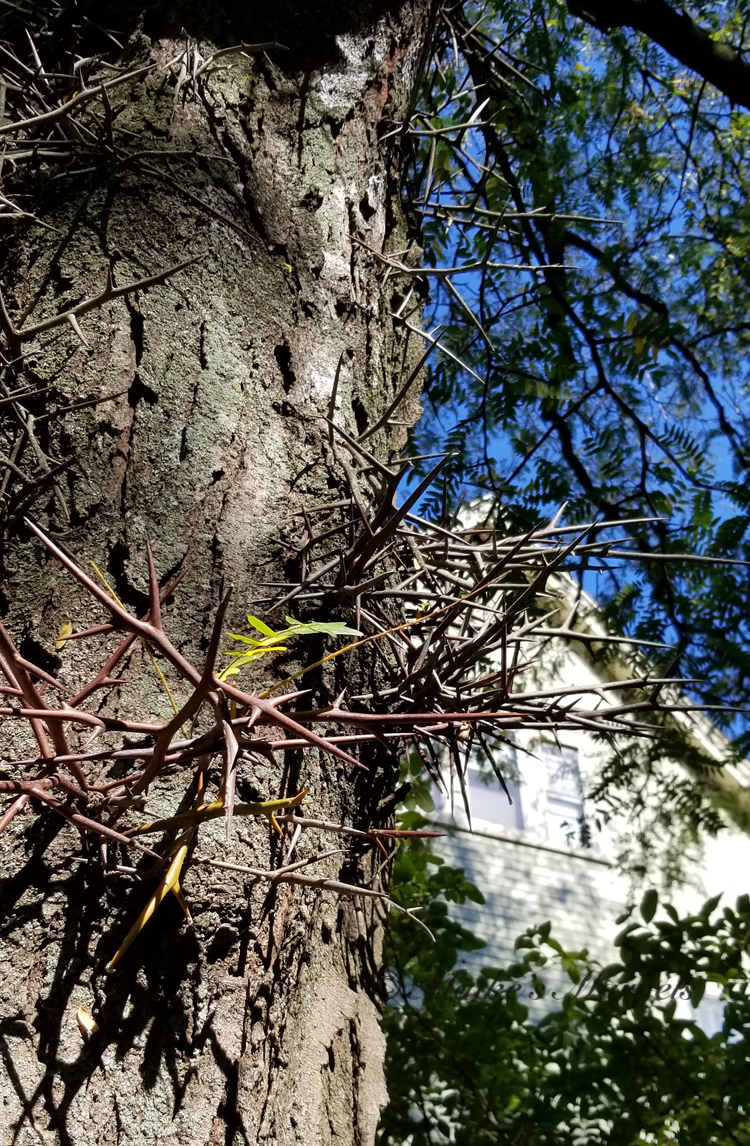 This spiky tree leads to a spooky intersection.