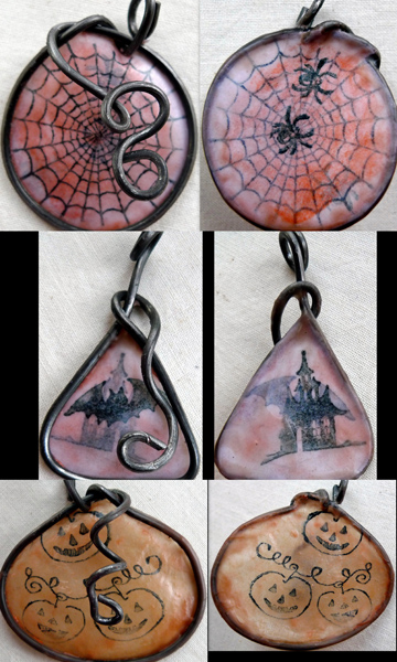 … and made a few spooky wax and wire pendants: Spiderweb, Bat House, and Triple Pumpkins.