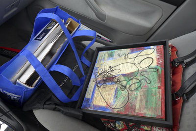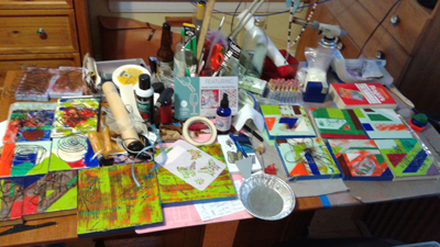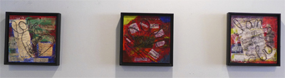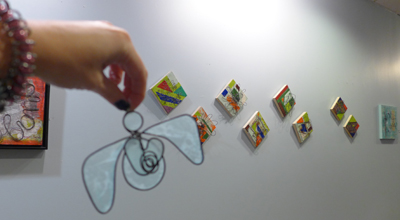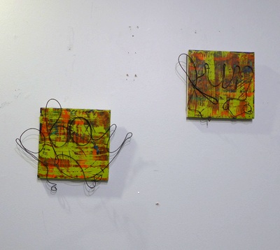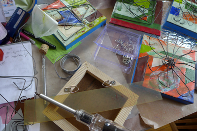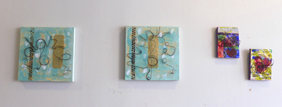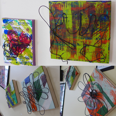 Then I fused the wire to the encaustic backgrounds and did the hanging test to make sure the shapes would stay put.