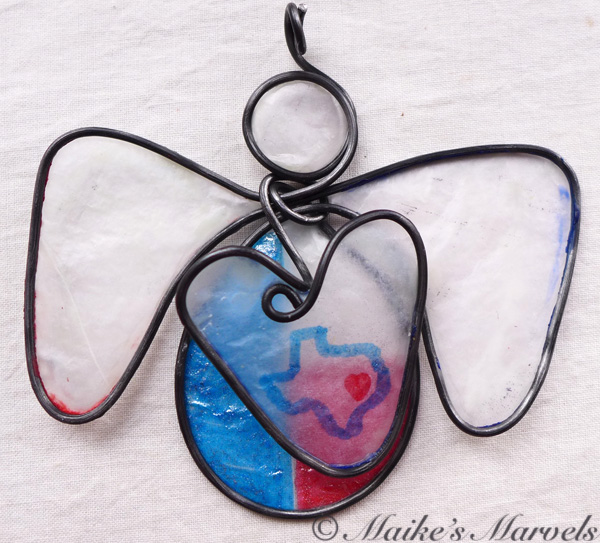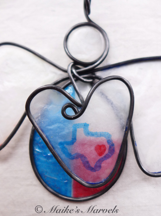 With my heart heavy, I decided to get back into my commissions yesterday, and worked on a Texas angel as well. Concentrating on the wire and pieces I have been assigned to make helped settle me again. I should remember that art is therapeutic, and that it would have helped me last week as well.