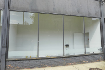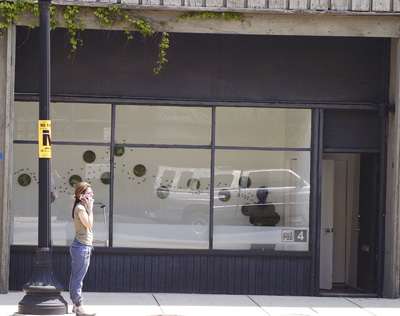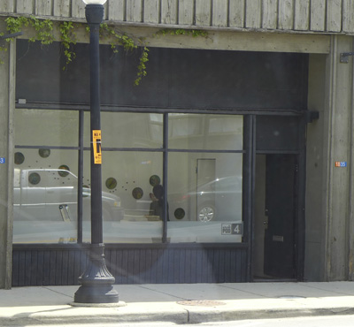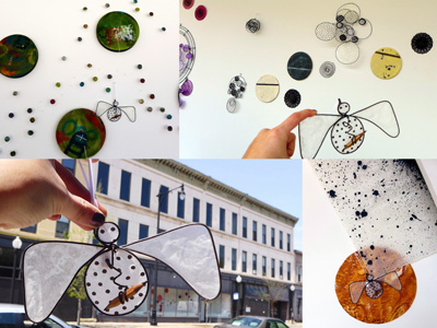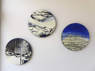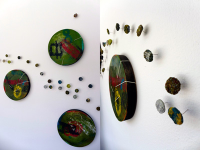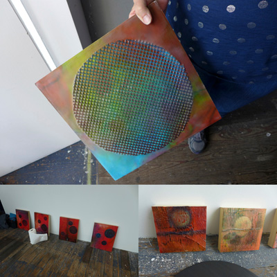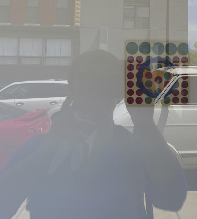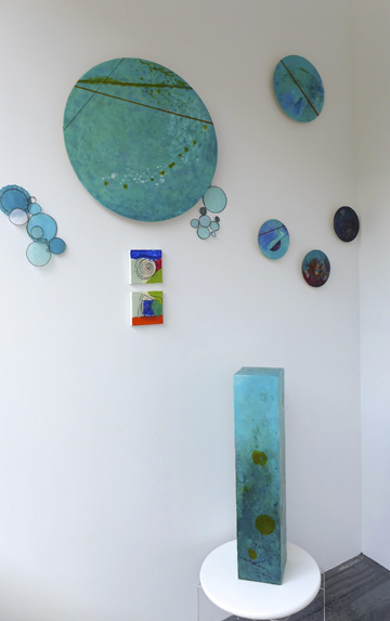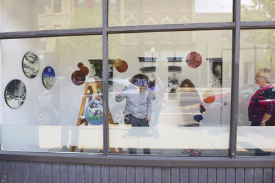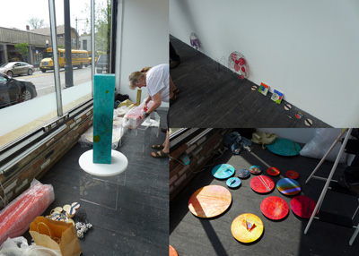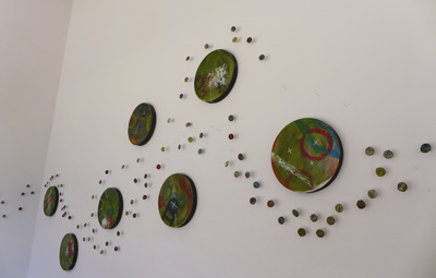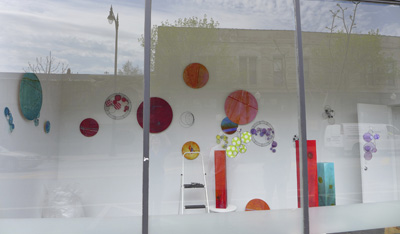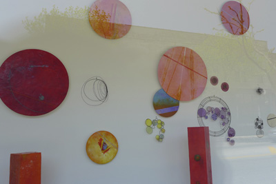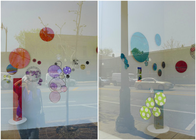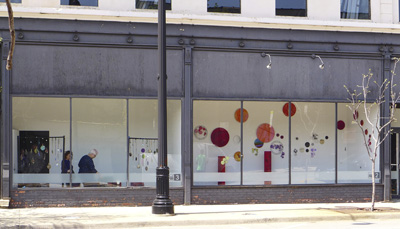 Each of the 7 windows is an installation by two artists, which is joined to the other 6 windows by the medium of encaustic and the connecting form of the dot.