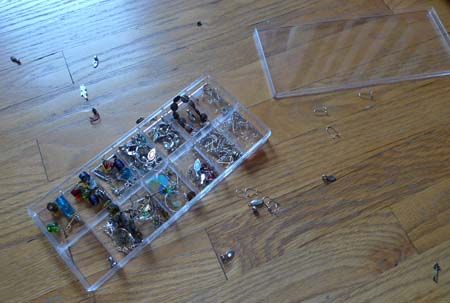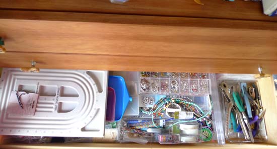 The table was cleared for my homework (though I ended up doing that on the floor) and my new goodies were inventoried right away. As I entered my new Mermaid Dowry items and looked for last year’s entries I found out that I never completed my beads drawer. I had counted all my buttons (746 of them) in one half of the drawer, but found few entries for bead-related materials in my spreadsheet.